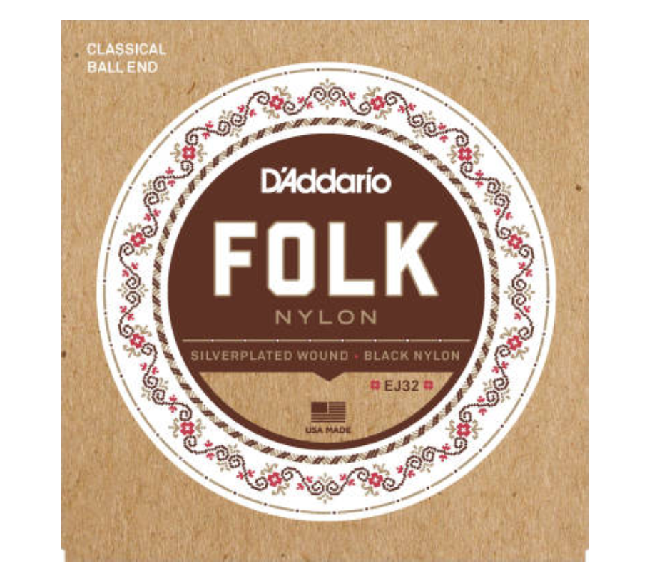 D'Addario classical guitar strings folk. Silver-plated wound, black nylon, ball end.