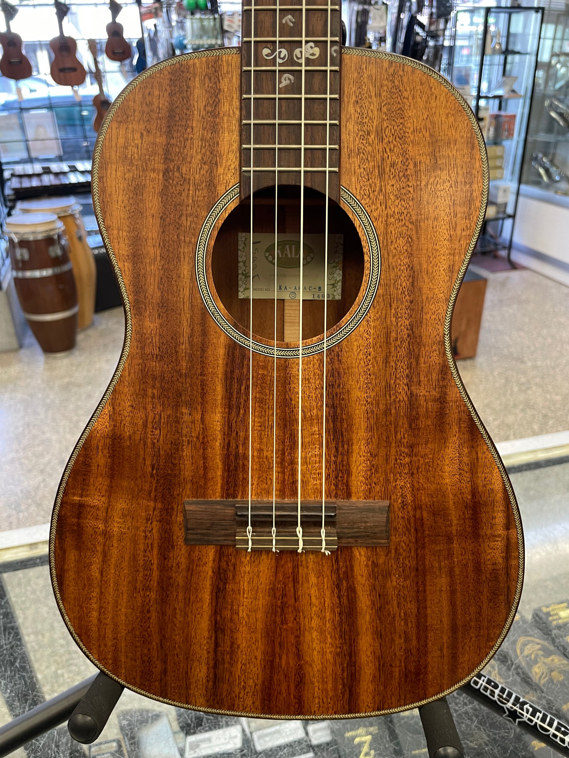 For Sale is a Pre-Owned Kala KA-ASAC-B Baritone Ukulele. This is a solid Acacia hardwood ukulele. This uke has been very well looked after and has just had a fresh set of strings installed. It has a simple satin finish with beautiful inlays on the fretboard and binding. The uke feels great in the hands and is very resonant throughout the entire range. Comes with a hardshell case.