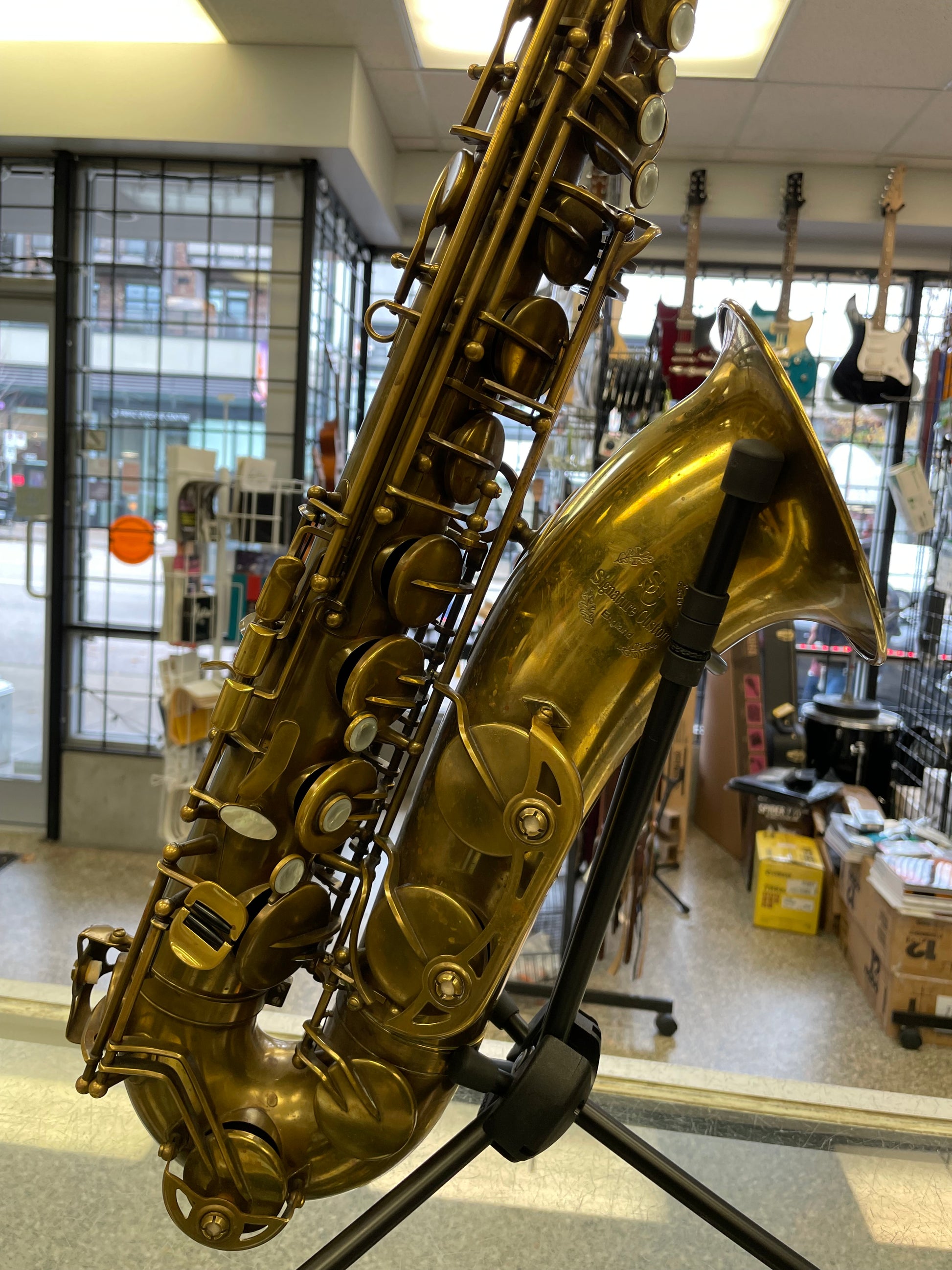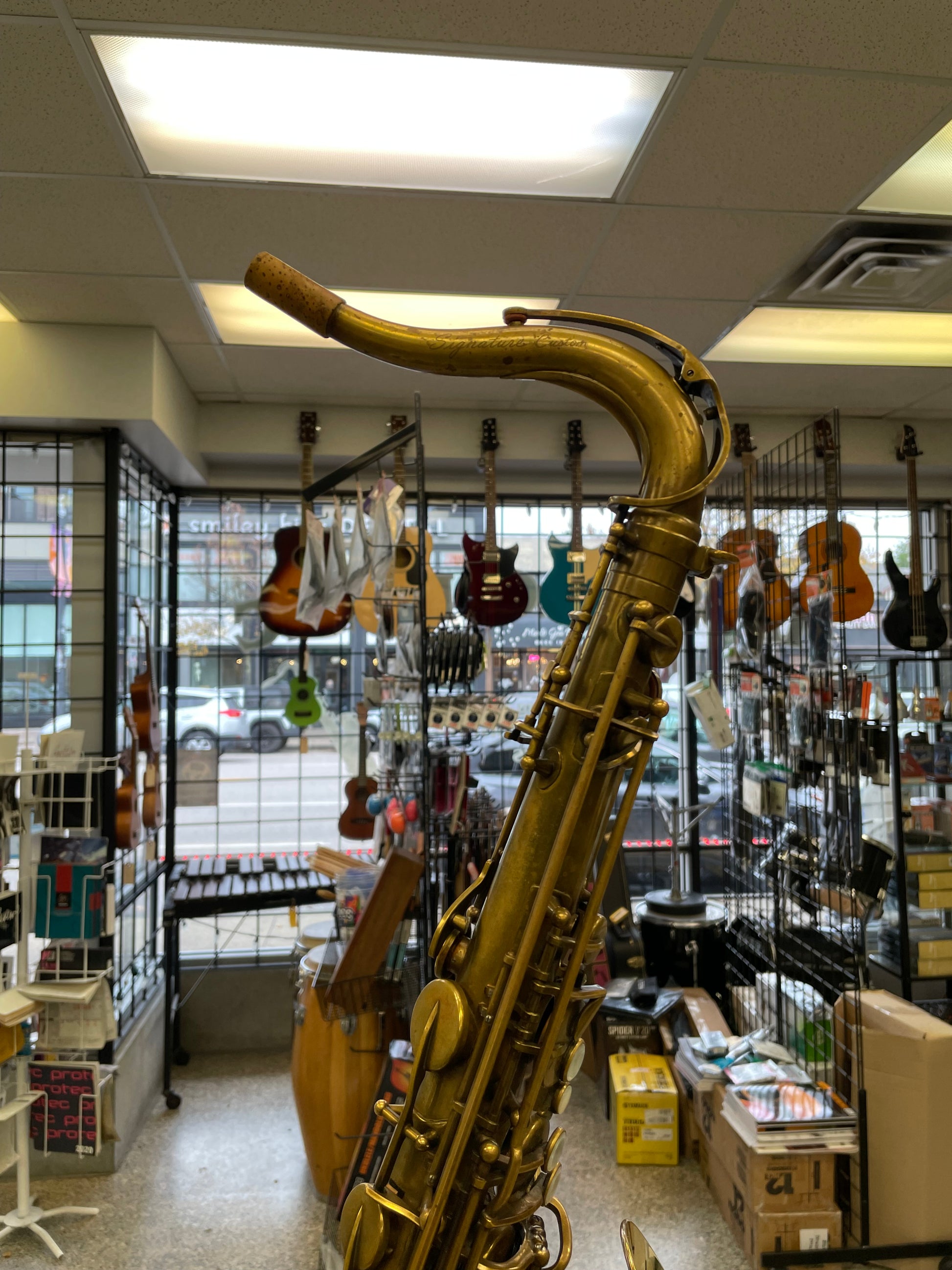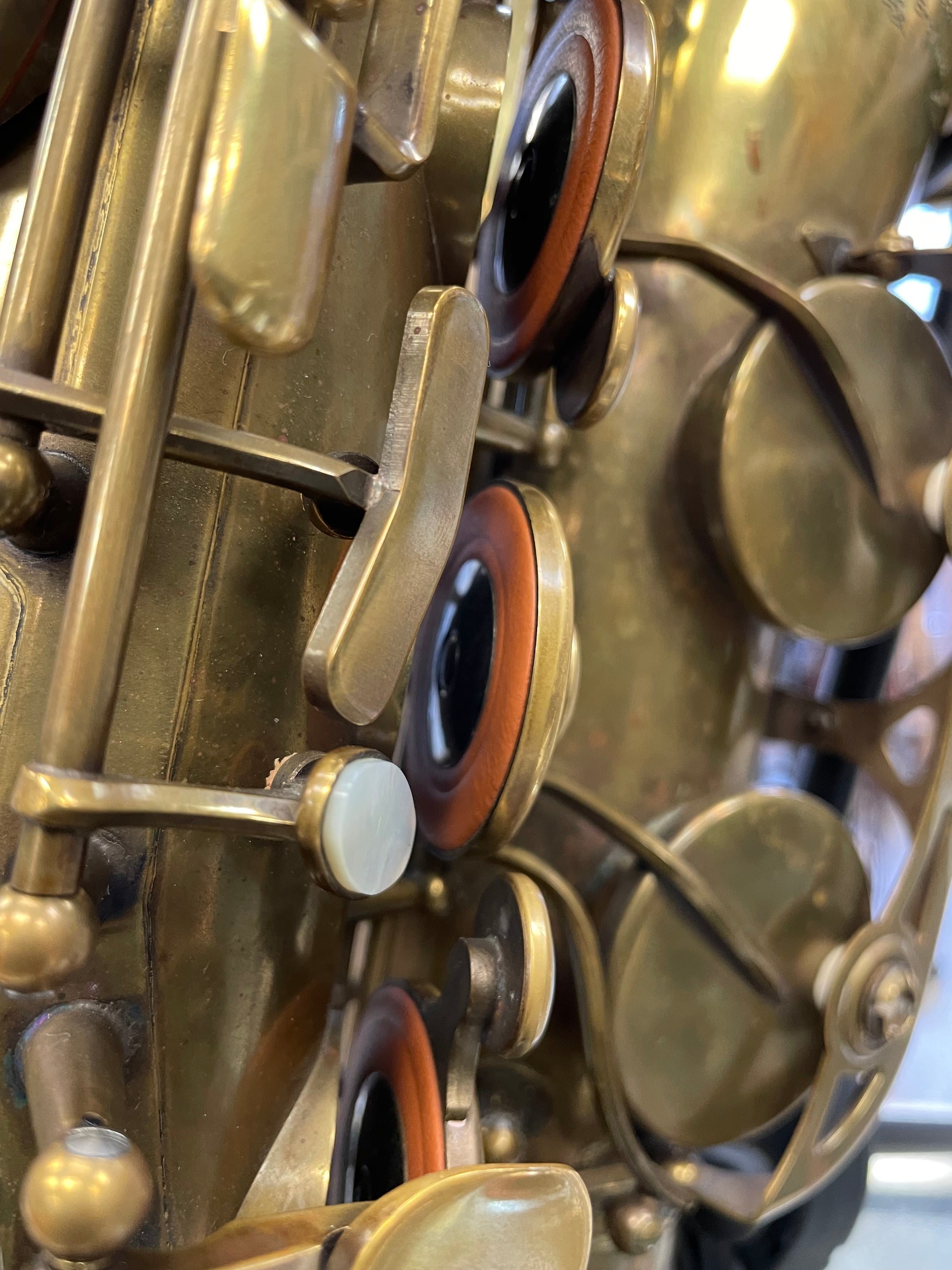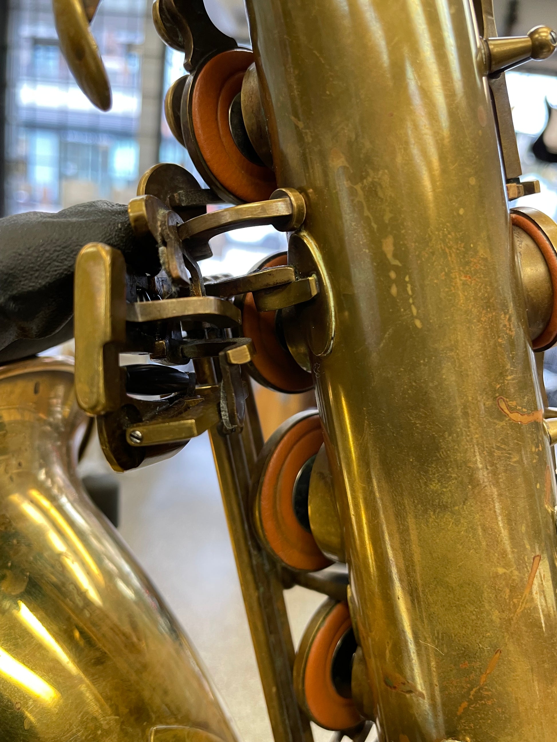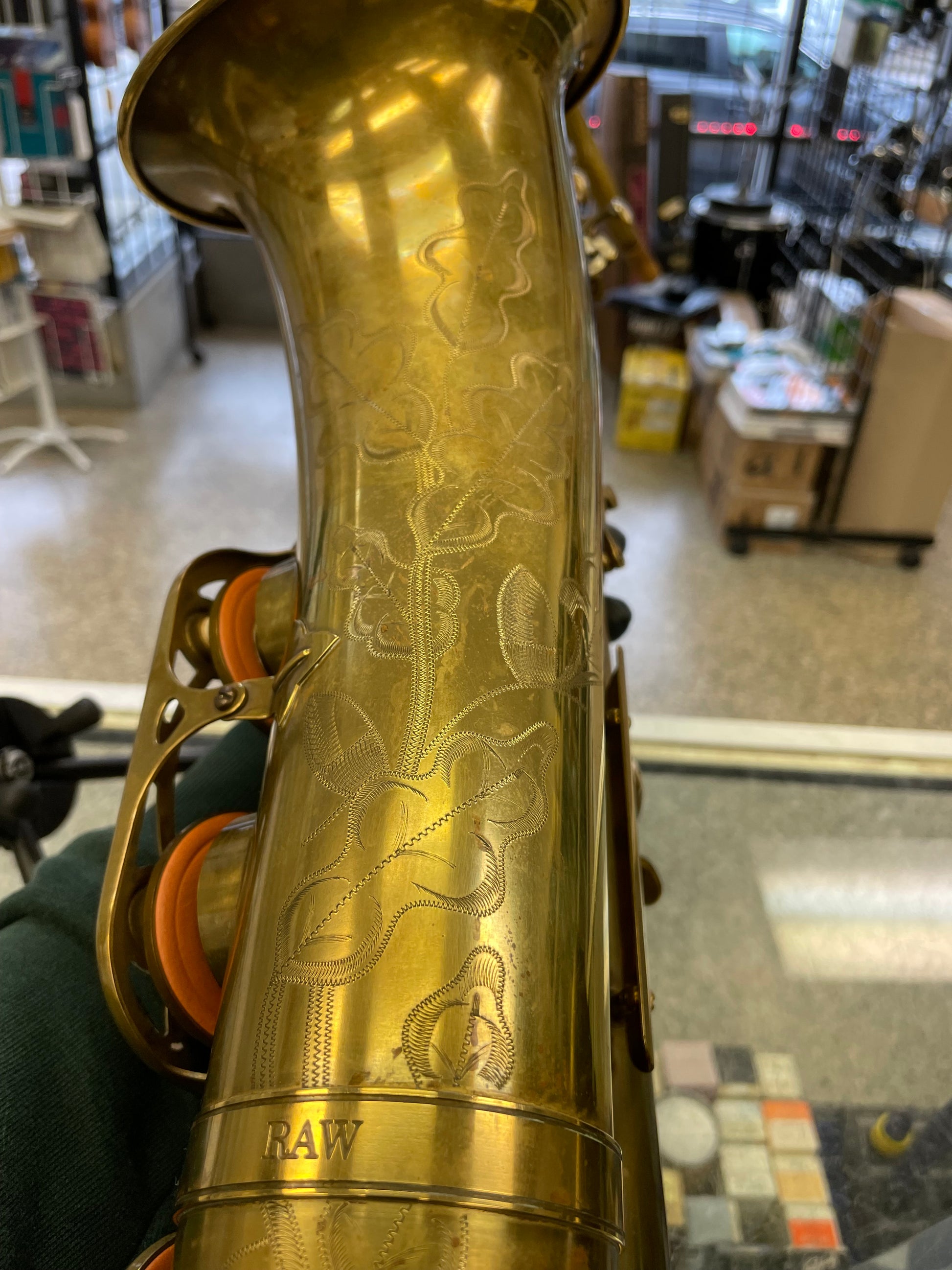 This horn is in great mechanical condition and ready to be played. The RAW XS model is unlacquered and hand polished in the factory but does age over time. This one has developed a nice patina but can be polished back to a high luster.