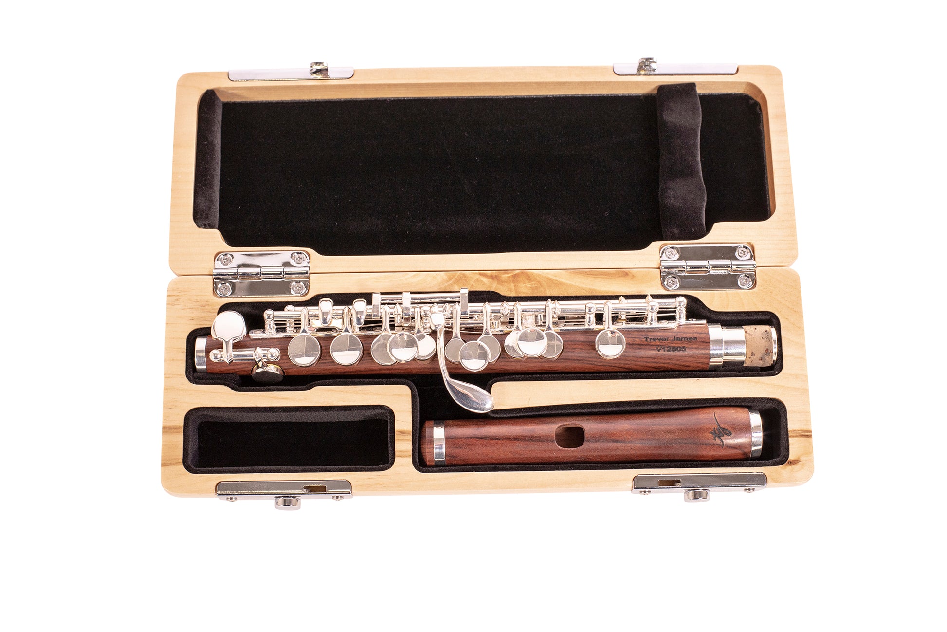 The latest addition to the Trevor James flute family is the beautiful Mopane (Rosewood) model piccolo with headjoint embouchure cut by English maker Andrew Oxley. This new TJ wooden piccolo model not only looks fantastic, its also tonally different from the usual Grenadilla wood models which you would usually associate with step-up piccolos. It has been designed with ease of playing and quality of sound production as it's primary focus. This TJ rosewood piccolo has a well-rounded tone with the capacity for clear and distinct notes. A beautifully performing instrument.